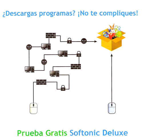 Esta publicidad de Softonic resume en una imagen las ventajas de descargar programas a través de su sitio.